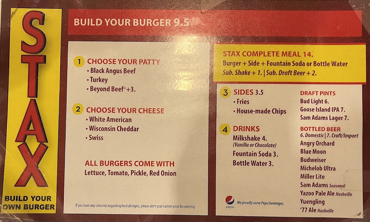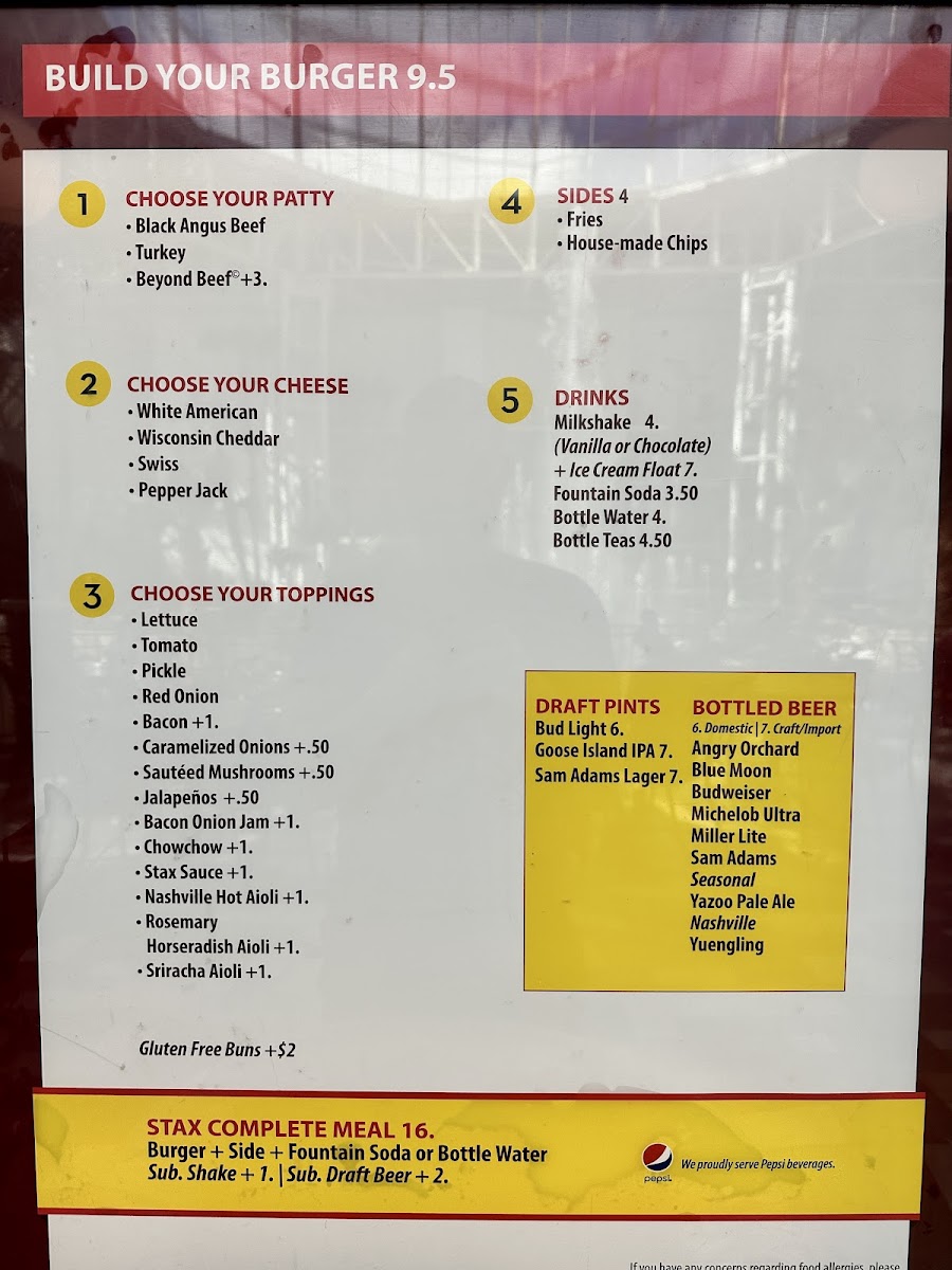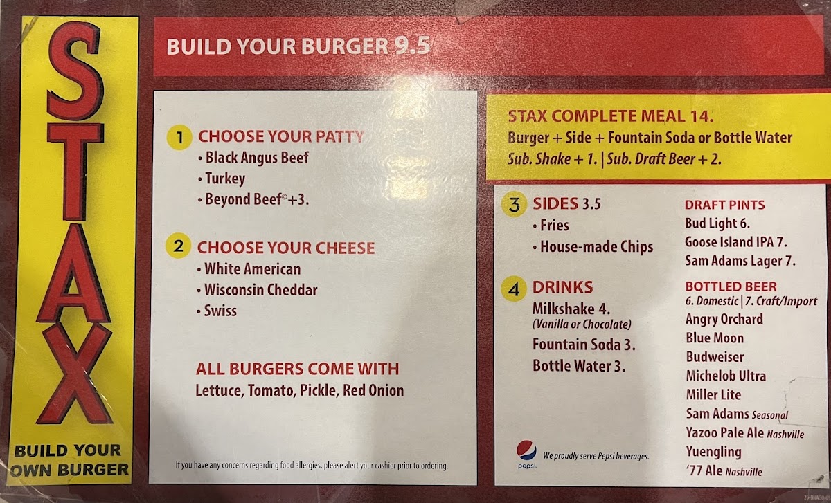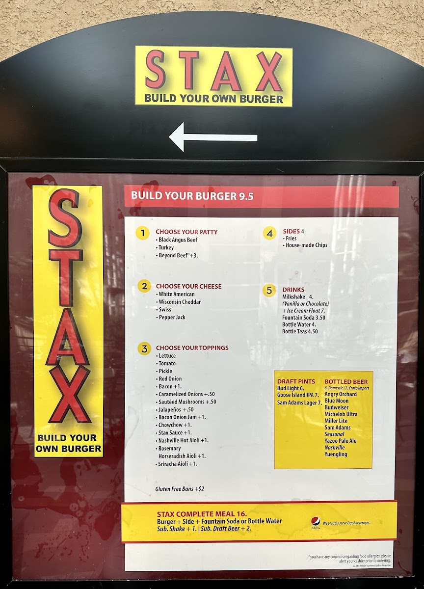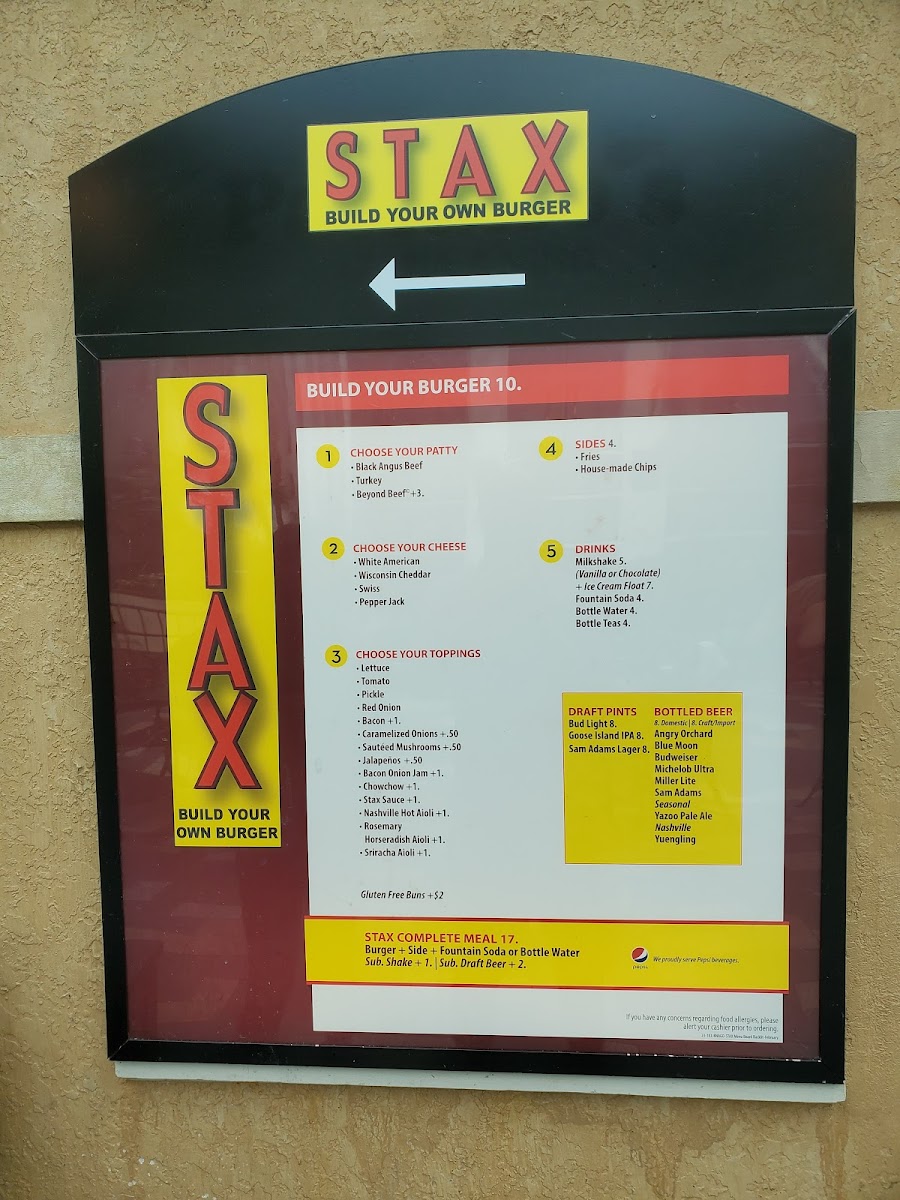 Highlights include customizable burgers made with Angus beef and topped with fresh ingredients, paired with crispy Stax fries or crunchy house-made chips. For those looking to unwind, a small selection of drinks such as creamy milkshakes, fountain sodas, and a variety of domestic bottled beers complement the food without overwhelming the experience.